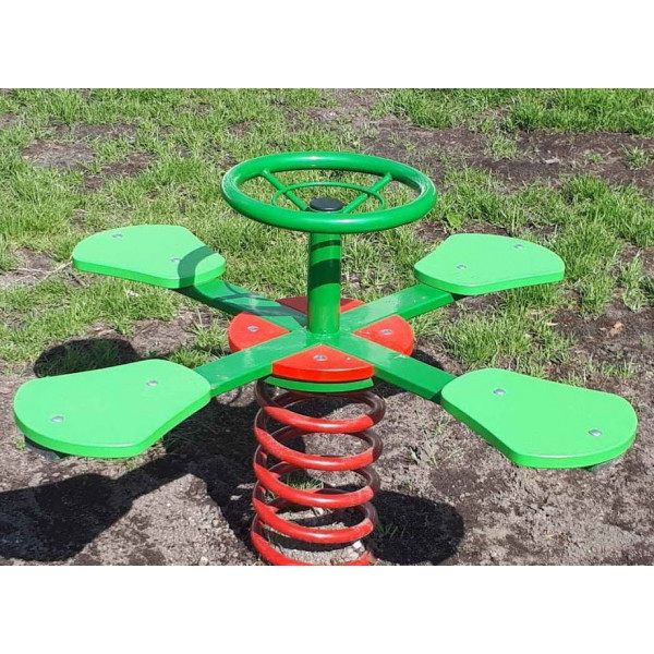 Bujak sprężynowy "koniczynka" posiada szkielet i kierownicę ze stali ocynkowanej i malowanej proszkowo. Siedziska i elementy ozdobne wykonano płyty HDPE. Urządzenie jest osadzone na atestowanej sprężynie. Koniczynka posadowiona jest w gruncie za pomocą cokołu betonowego. Bujak nadaje się do zabawy dla czterech dzieci. Jest wygodny, bezpieczny i przyjemny dla oka.